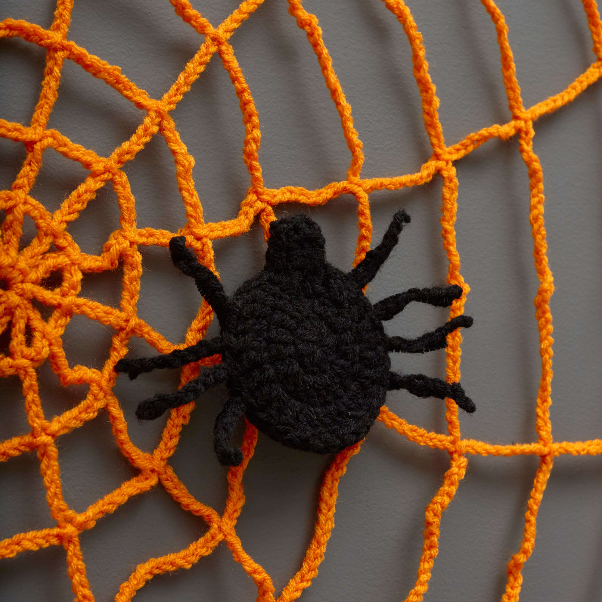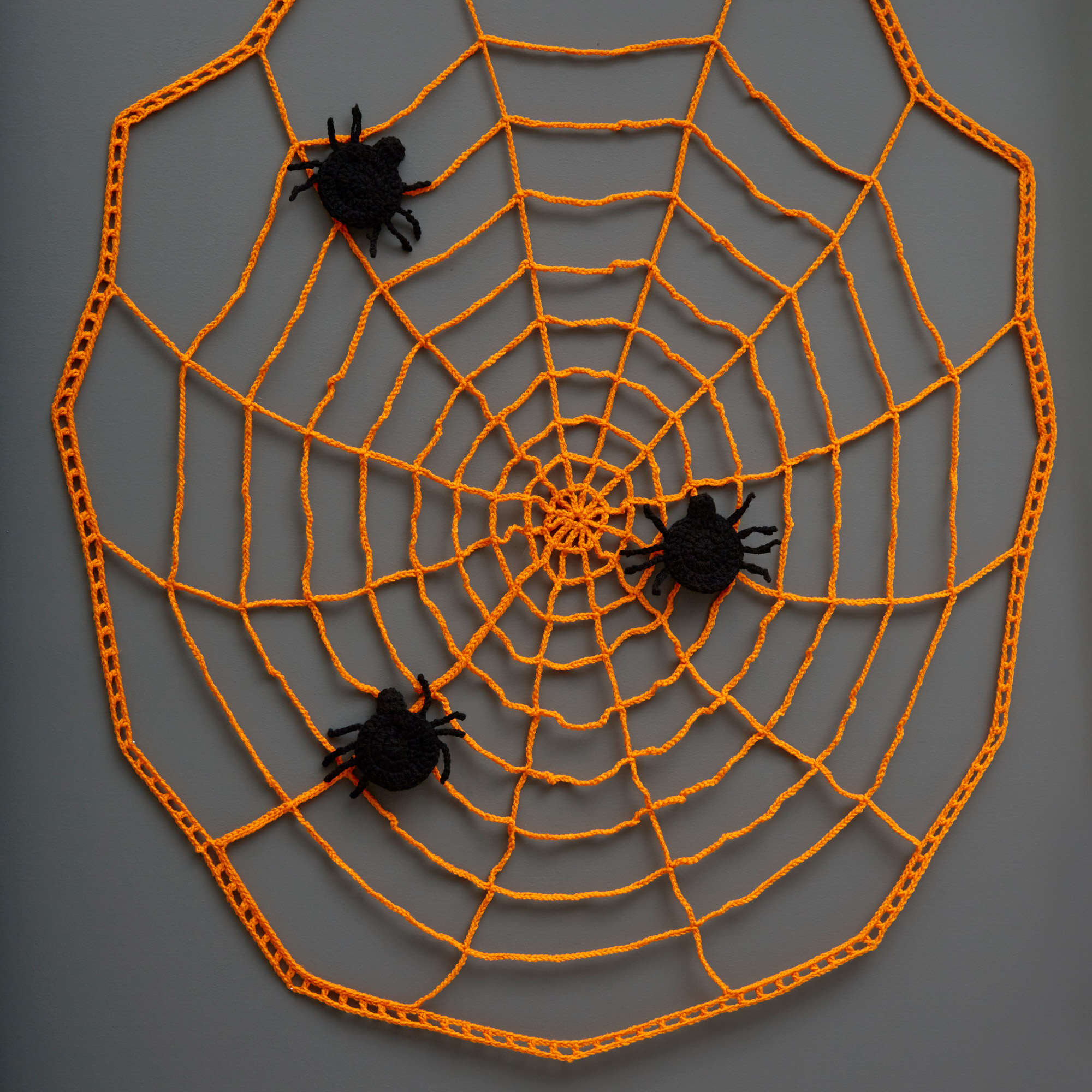 Crochet a Halloween wall decoration that can also provide a fun party game opportunity! Children (or adults) are blind folded and see who can pin the spider closest to the center of the web. Apply a small square of adhesive tack to each spider and let the games begin!