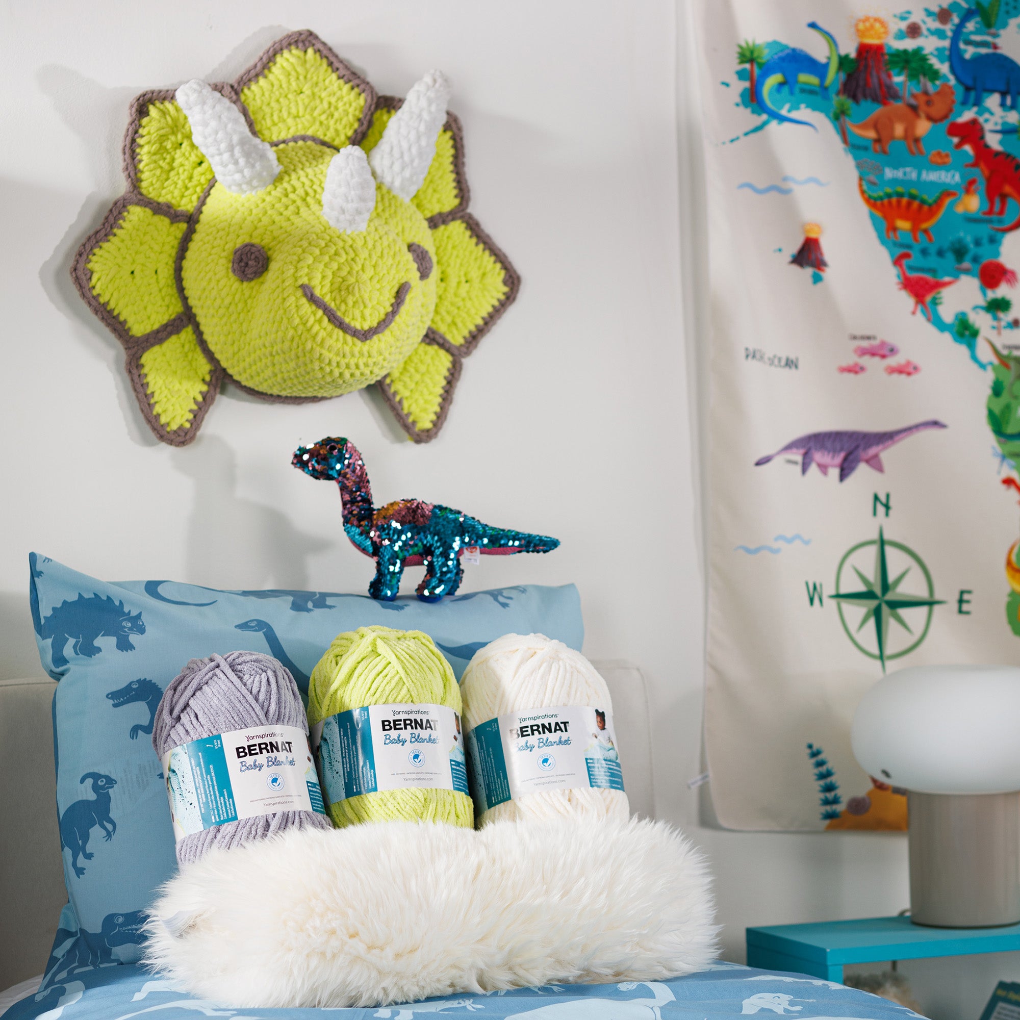 Dial-up your dino décor with this crochet faux taxidermy Triceratops from Bernat Baby Blanket.