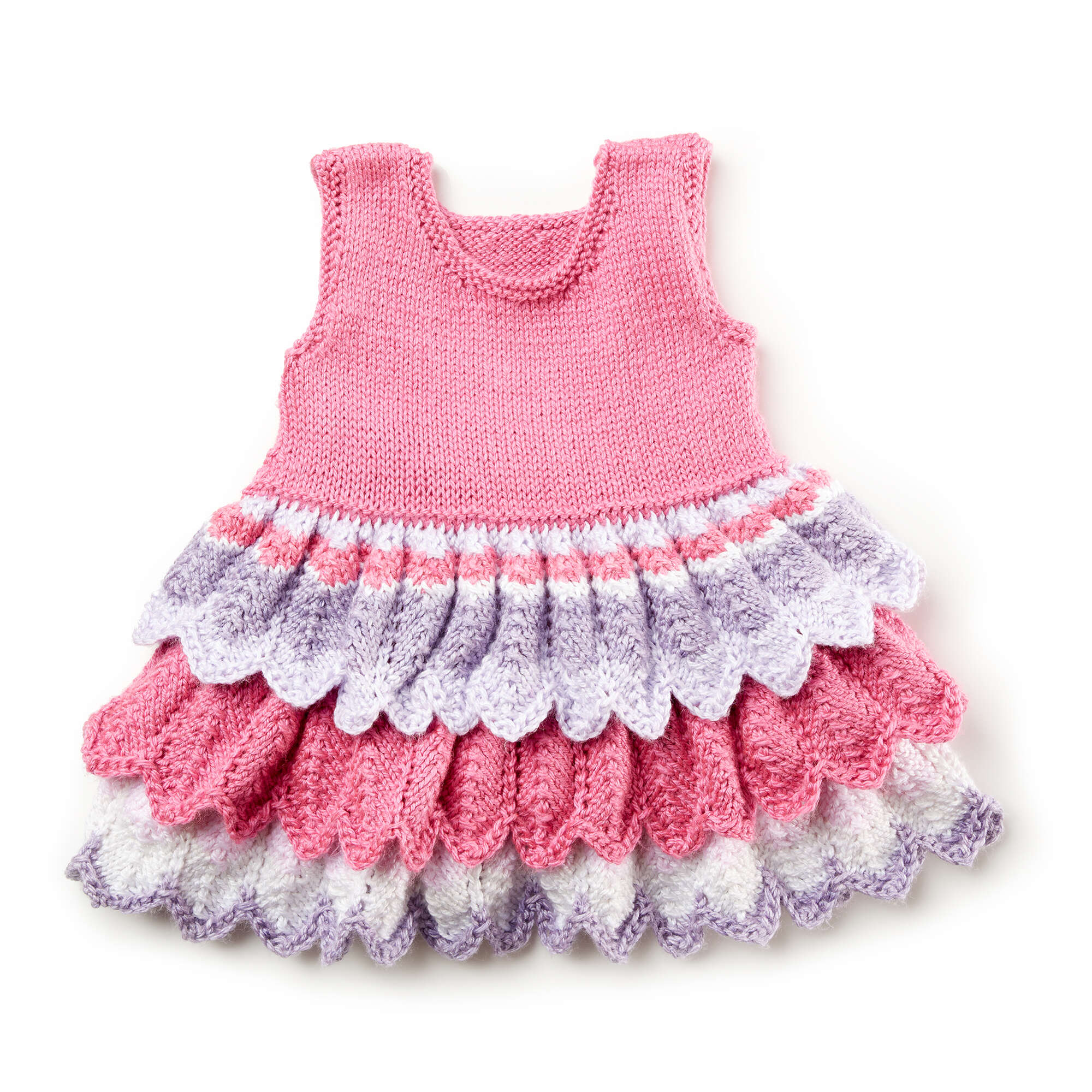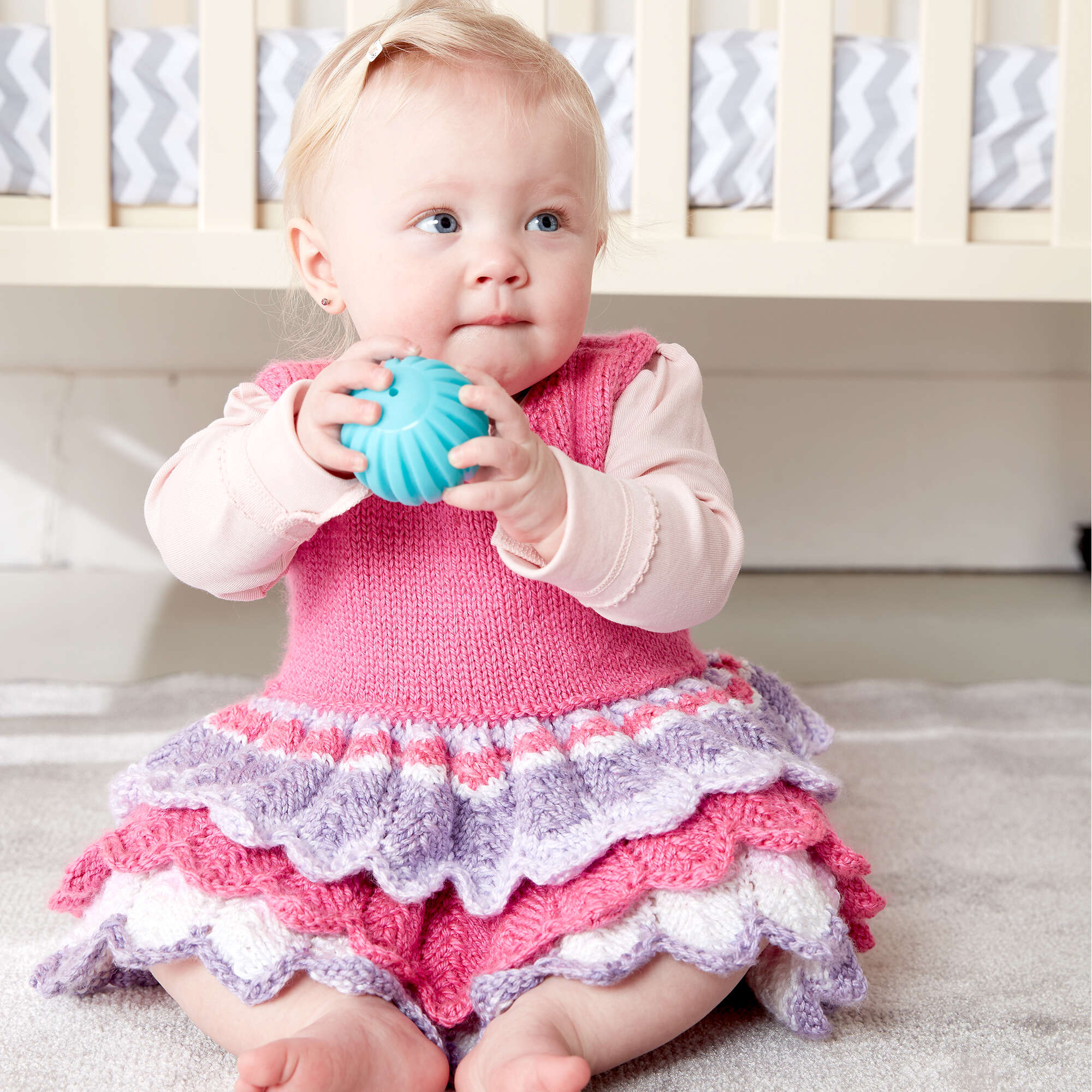 This intermediate knit pattern creates an adorable knit dress with ruffles!. Make it with Bernat Softee Baby Stripes to create a fun and colorful knit baby garment.