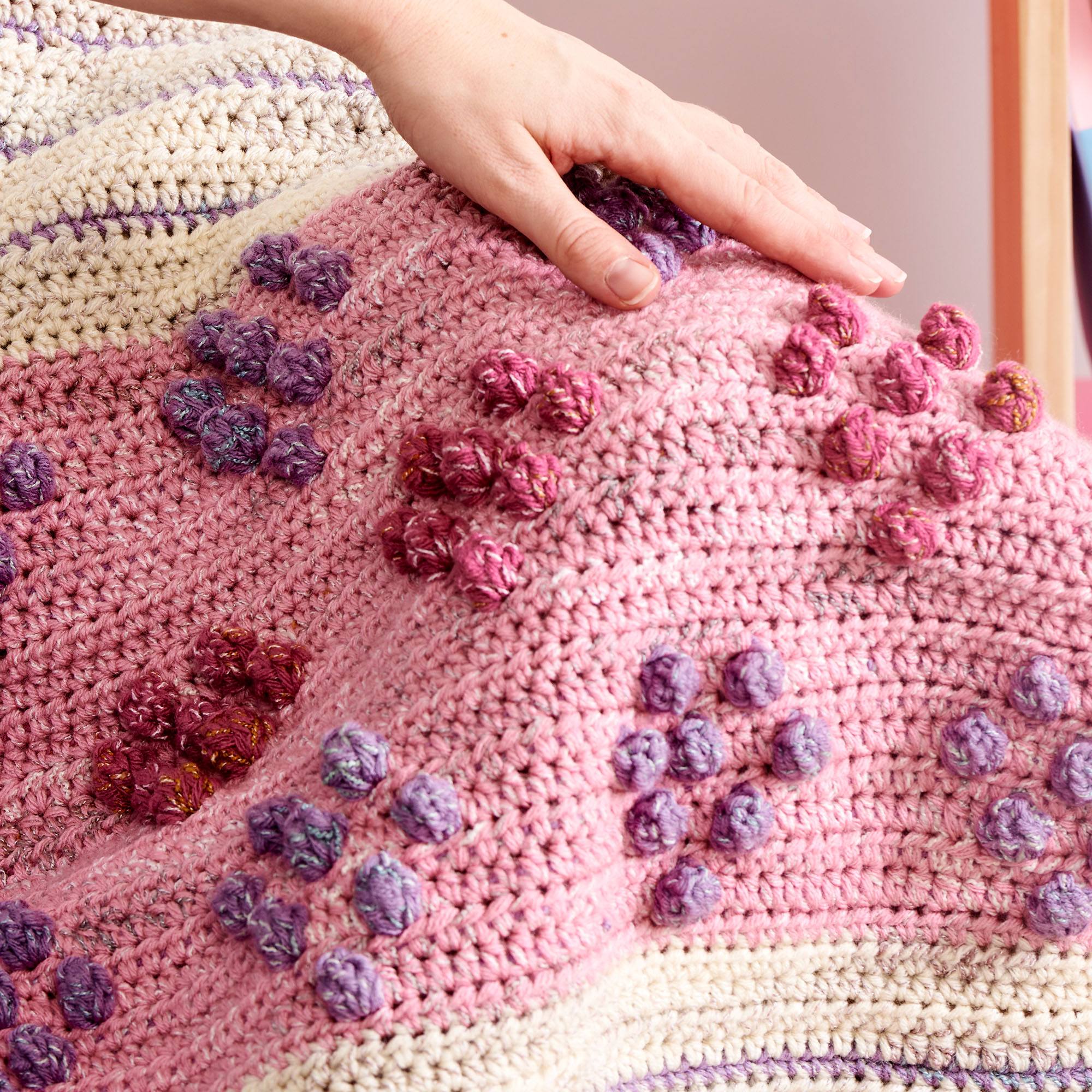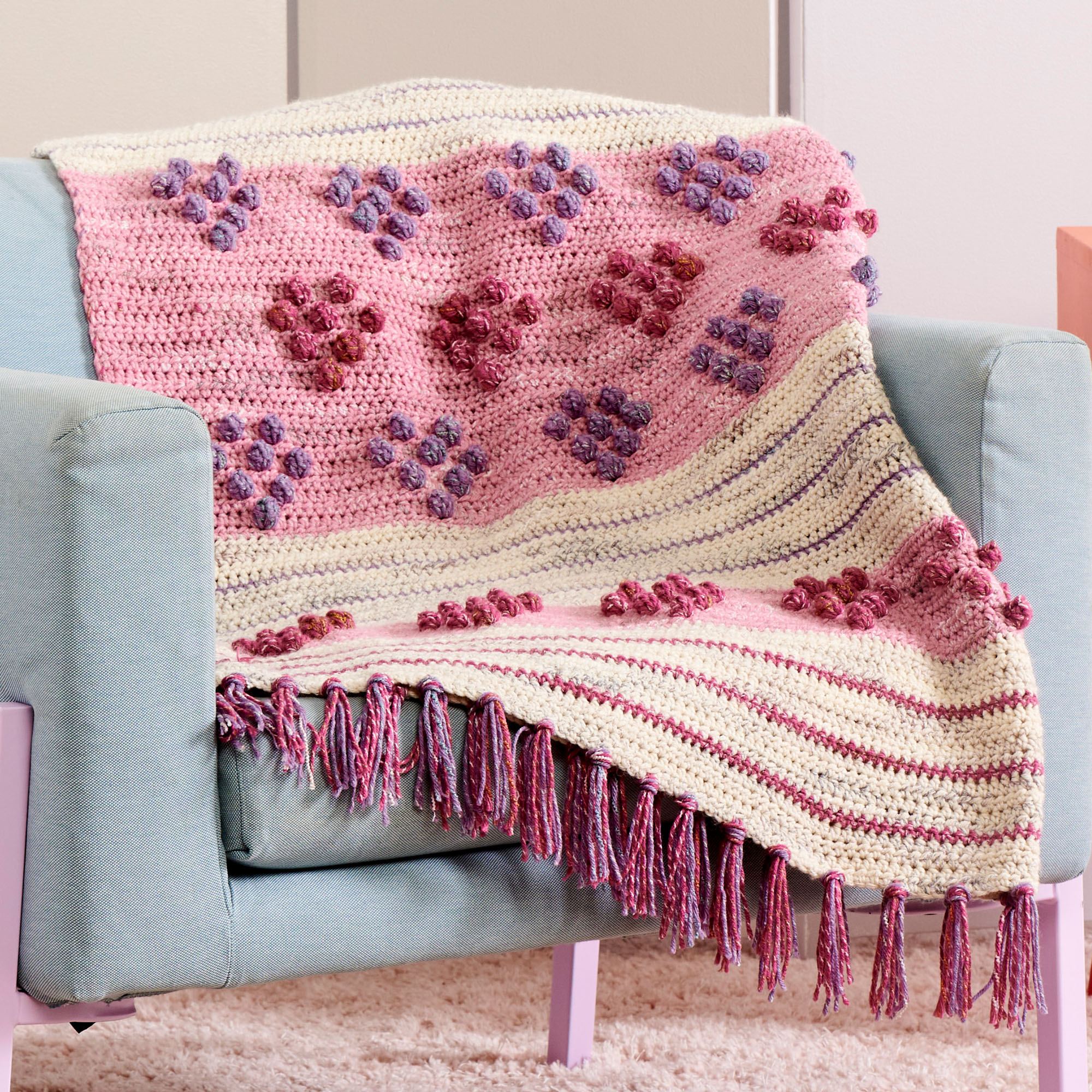 This luscious crochet bobble blanket is featured and Caron Jumbo Twirl.