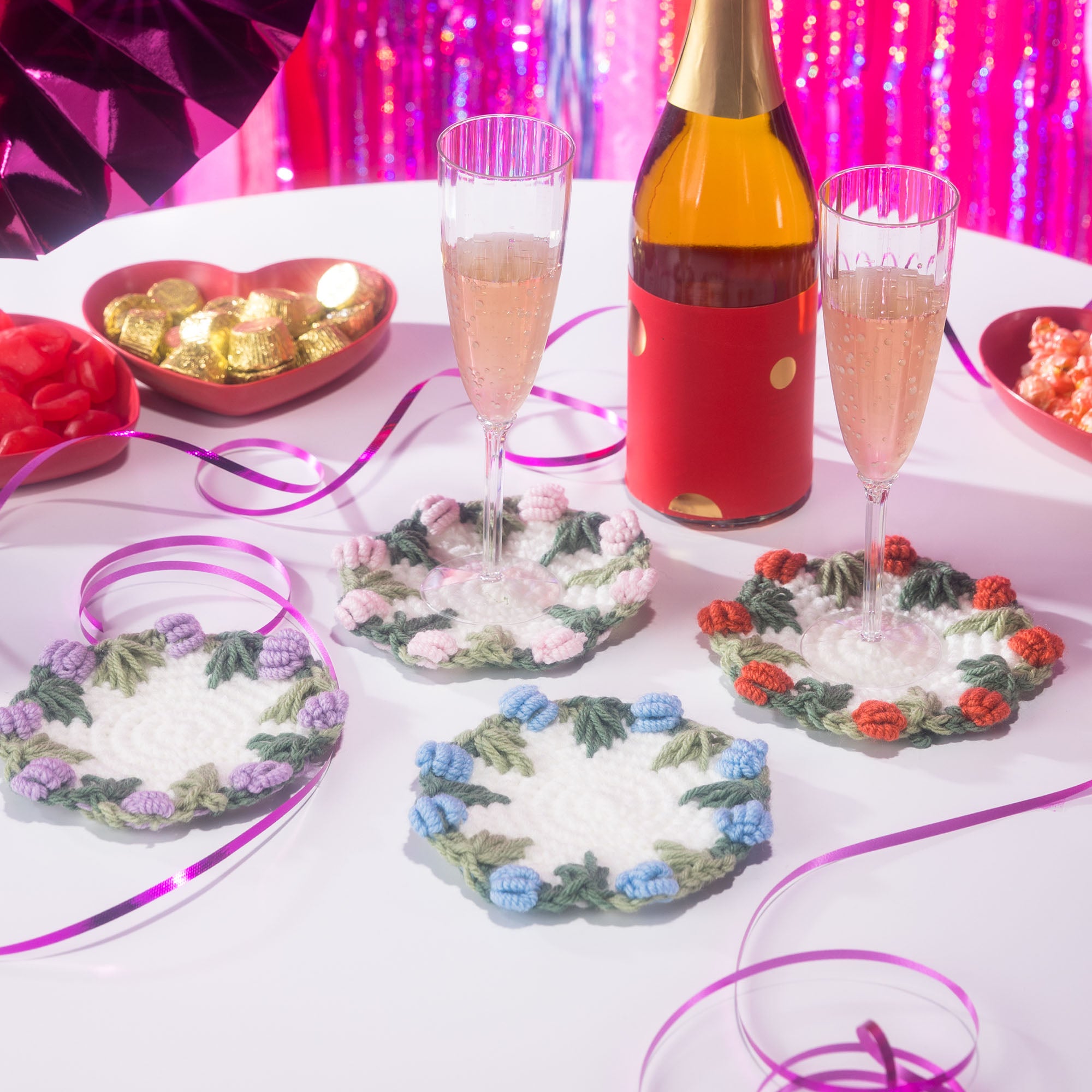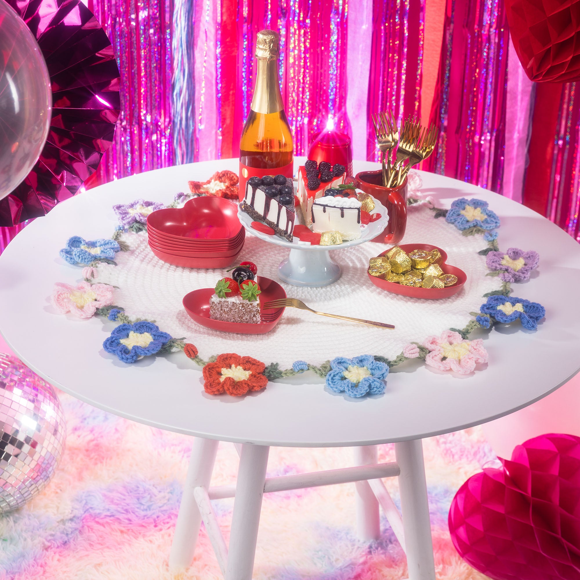 Tablecloth: Approx 24” [61 cm] diameter, excluding flowers.Placemat: Approx 12” [30.5 cm] diameter, excluding flowers.Coaster: Approx 4” [10 cm] diameter, excluding flowers.