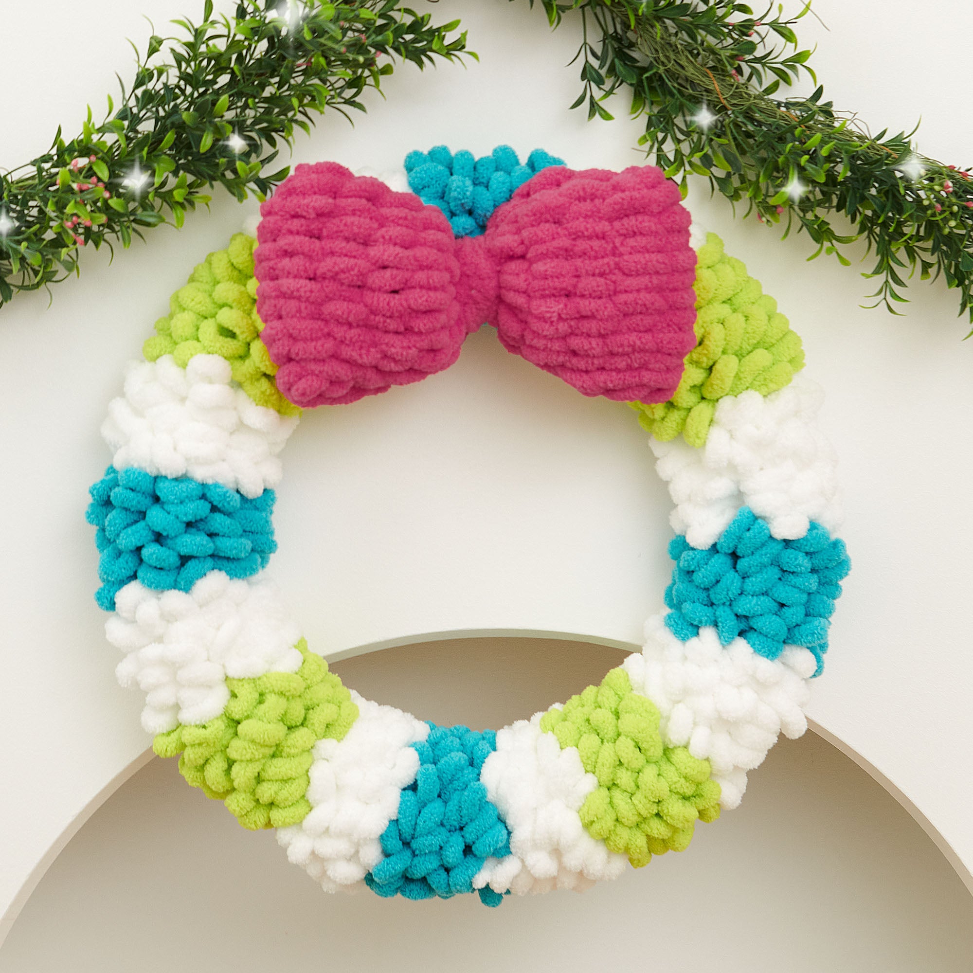 Decorate your home with this no-needle wreath from Bernat Alize Blanket-EZ Stripes.