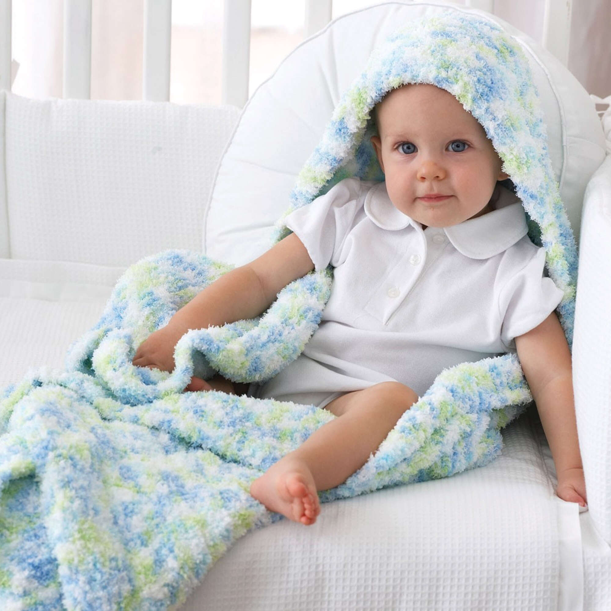 Keep heads and hearts warm with this hooded blanket, knitted in Bernat Pipsqueak.
