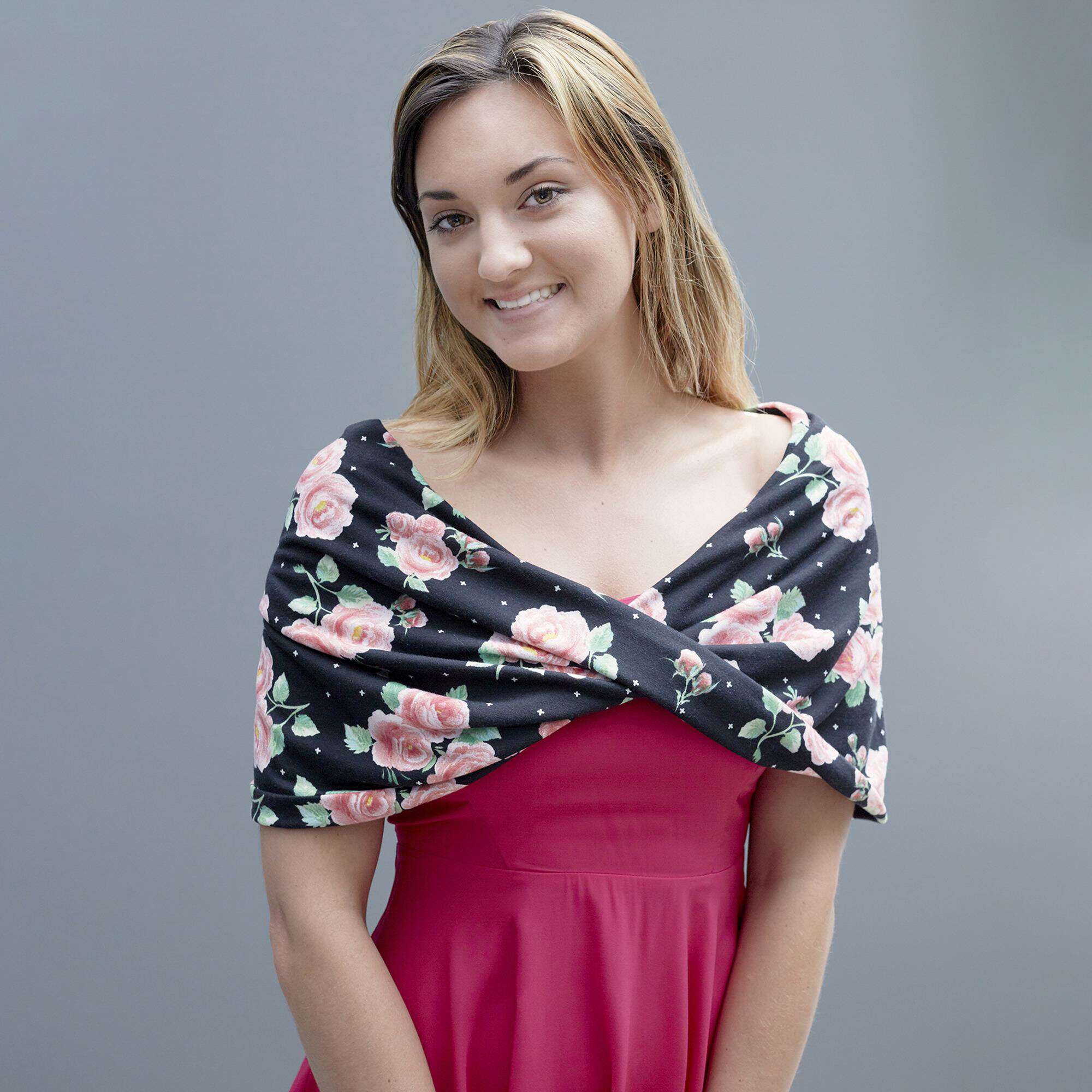 This shoulder wrap is a mobius—a twisted tube of fabric sewn from a stretch knit.