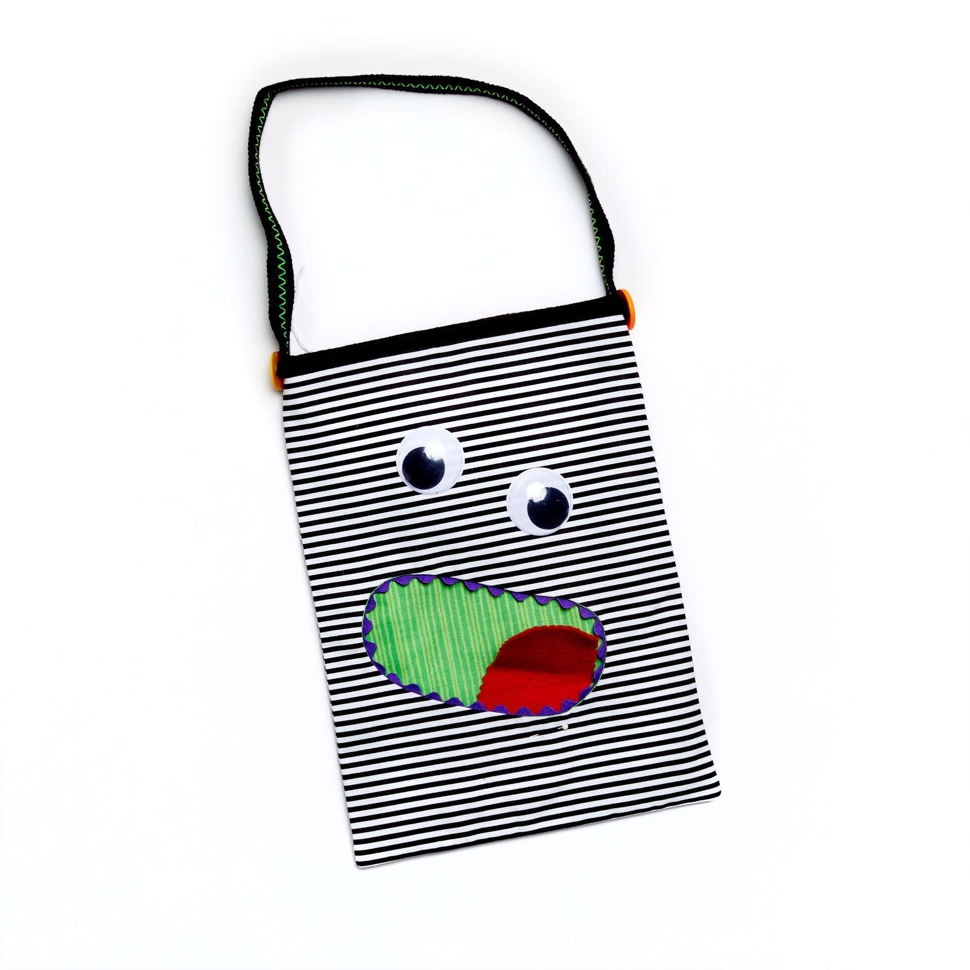 Trick-or-treating is more fun if you have a monster bag to hold goodies. This one has a “mouth pocket” for special treat, and a roomie interior. As an added plus, this bag is reversible. The bag is reversible to solid black.