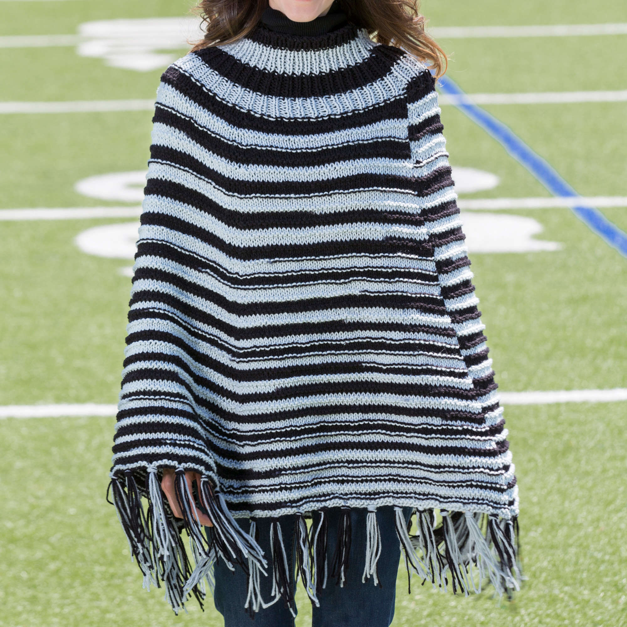 Three cheers for this rib-neck knit poncho in Red Heart Team Spirit!